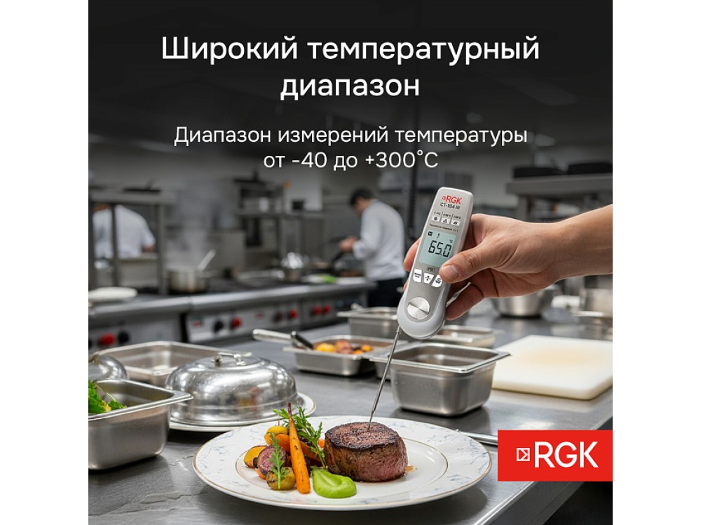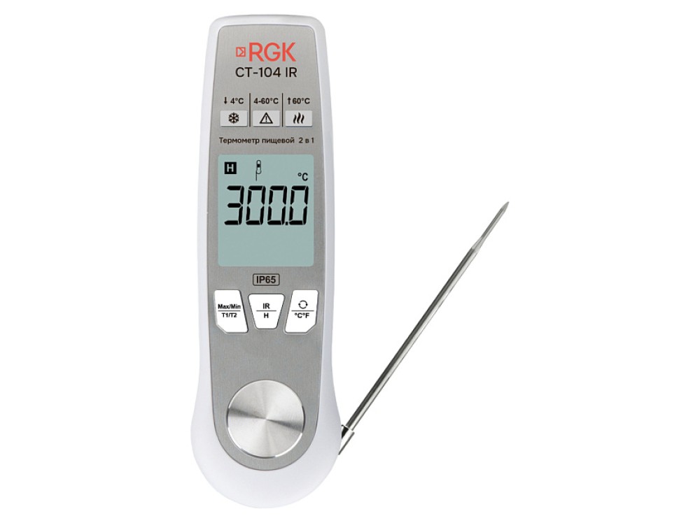 Пищевой термометр RGK CT-104 IR представляет собой комбинированный инструмент, обеспечивающий контроль поверхностной и внутренней температуры продуктов, сырья, полуфабрикатов, а также других целевых объектов, для чего оборудуется инфракрасной системой, реализующей функции пирометра, и погружным зондом. Обладая широким измерительным диапазоном, изделие подходит как для отслеживания условий хранения термолабильной продукции, в том числе замороженной, так и для оценки соблюдения технологии приготовления пищи с применением тепловой обработки. Комбинированный измеритель температуры внесен в Госреестр СИ и может задействоваться в качестве средства оперативного контроля при инспекционных проверках, в ходе экспертиз и для решения других задач, попадающих под государственное регулирование.