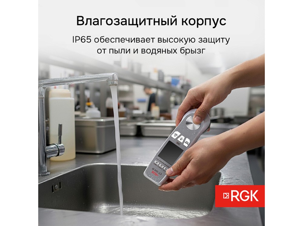 Прибор не нуждается в специальных настройках. Помимо дисплея с цифровой индикацией, отображающей результаты измерений, пищевой термометр RGK CT-104 IR снабжен температурной сигнализацией с интуитивно понятными символами световых индикаторов. Она настроена и откалибрована в заводских условиях согласно требованиям ХАССП, что позволяет быстро оценивать соответствие температурных условий сбережения продуктов питания действующим нормам безопасности.